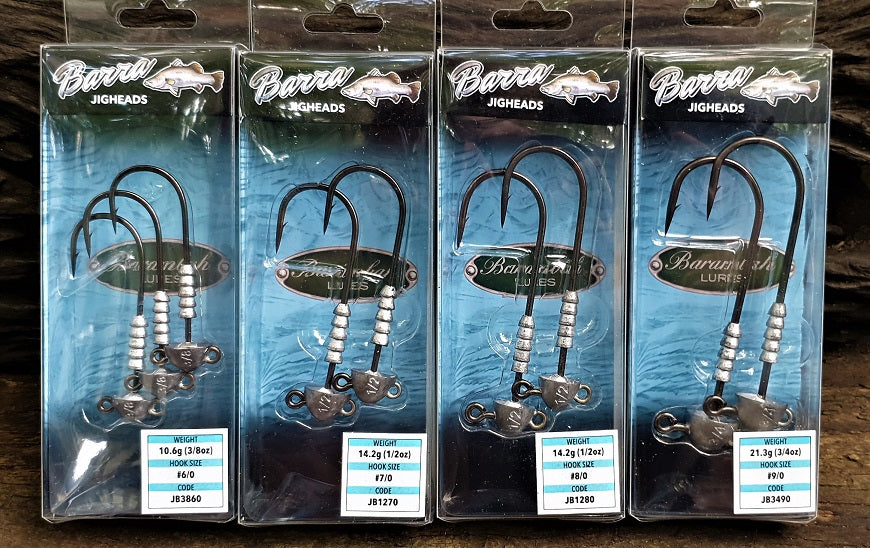 Built tough to handle Barramundi and Murray Cod! The range of Barra Jigheads are custom built for Barambah Lures on forged 4X strong black nickel hooks. They have an ultra sharp hook and oversized barb for optimum penetration and holding power. A unique feature is the assist eyelet to attach a treble hook or assist hooks for increased hook up rates. The head is engraved with both the weight and hook size for easy identification. Rigging of all types of plastics is easy and secure with the ultimate keeper. The go to PROVEN jigheads for all big barra! see picture gallery for some of the captures.